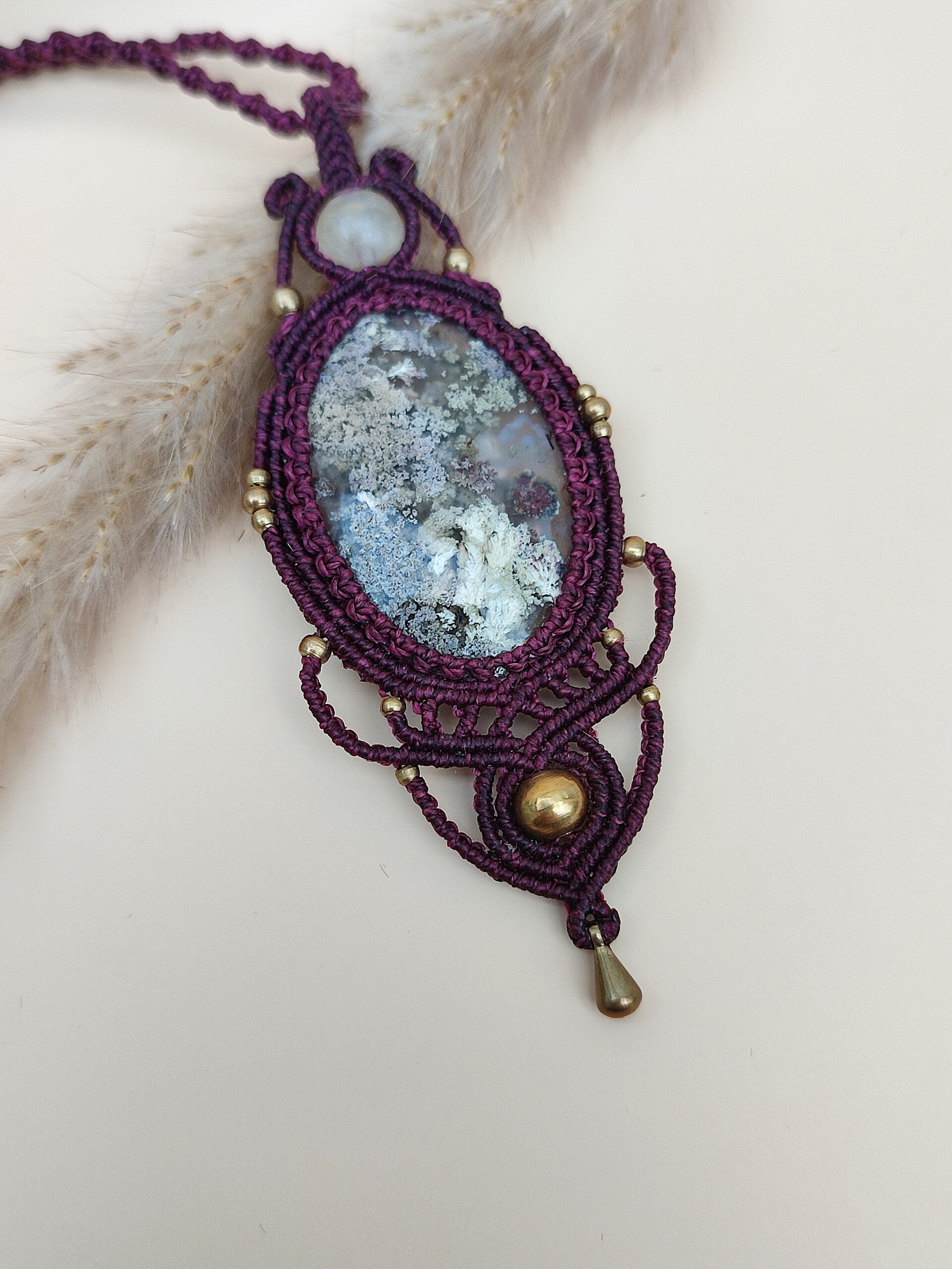 De centrale steen in deze ketting toont een prachtig landschap van insluitsels, alsof je in een miniatuurwereld kijkt. Het warme, bordeauxkleurige lijnenpatroon versterkt de aardende energie van de steen en vormt een sierlijk geheel. Bovenaan werd een kleine maansteen verwerkt, voor een vleugje zachtheid en vrouwelijke intuïtie.