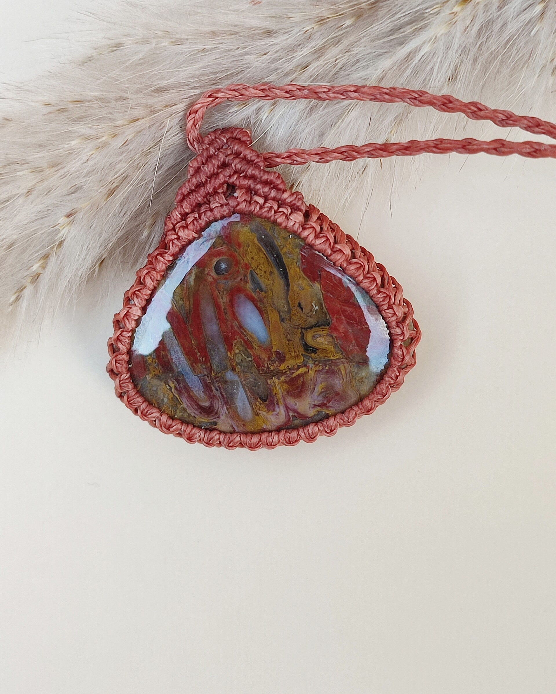 De rijke schakeringen van rood, oker, geel en zachte grijstinten geven deze ketting een levendige, natuurlijke uitstraling. Een krachtig maar harmonieus sieraad dat verbinding maakt met de aarde en tegelijk energie en beweging brengt.
