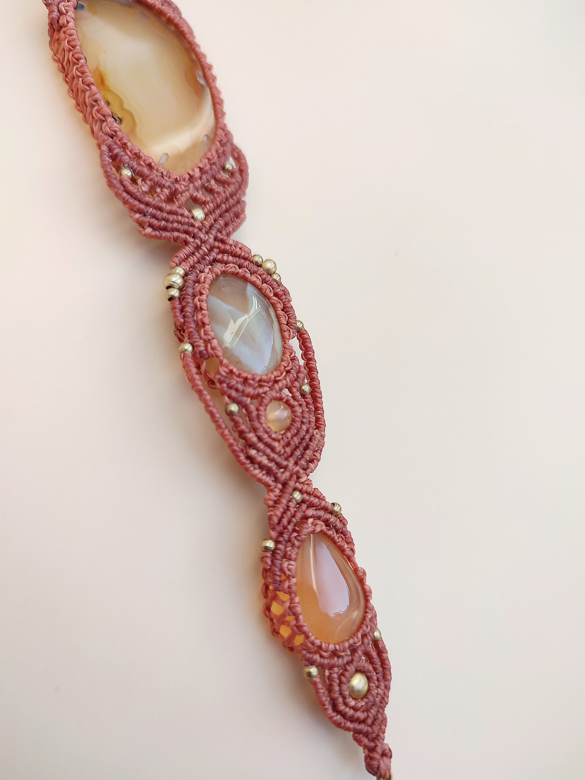 Deze raamdecoratie brengt een zachte, warme energie in je ruimte. Agaat staat bekend om zijn aardende en harmoniserende werking en helpt om rust en balans te creëren. Het licht dat door de steen en het knoopwerk valt, zorgt voor een kalme, serene sfeer aan je raam.